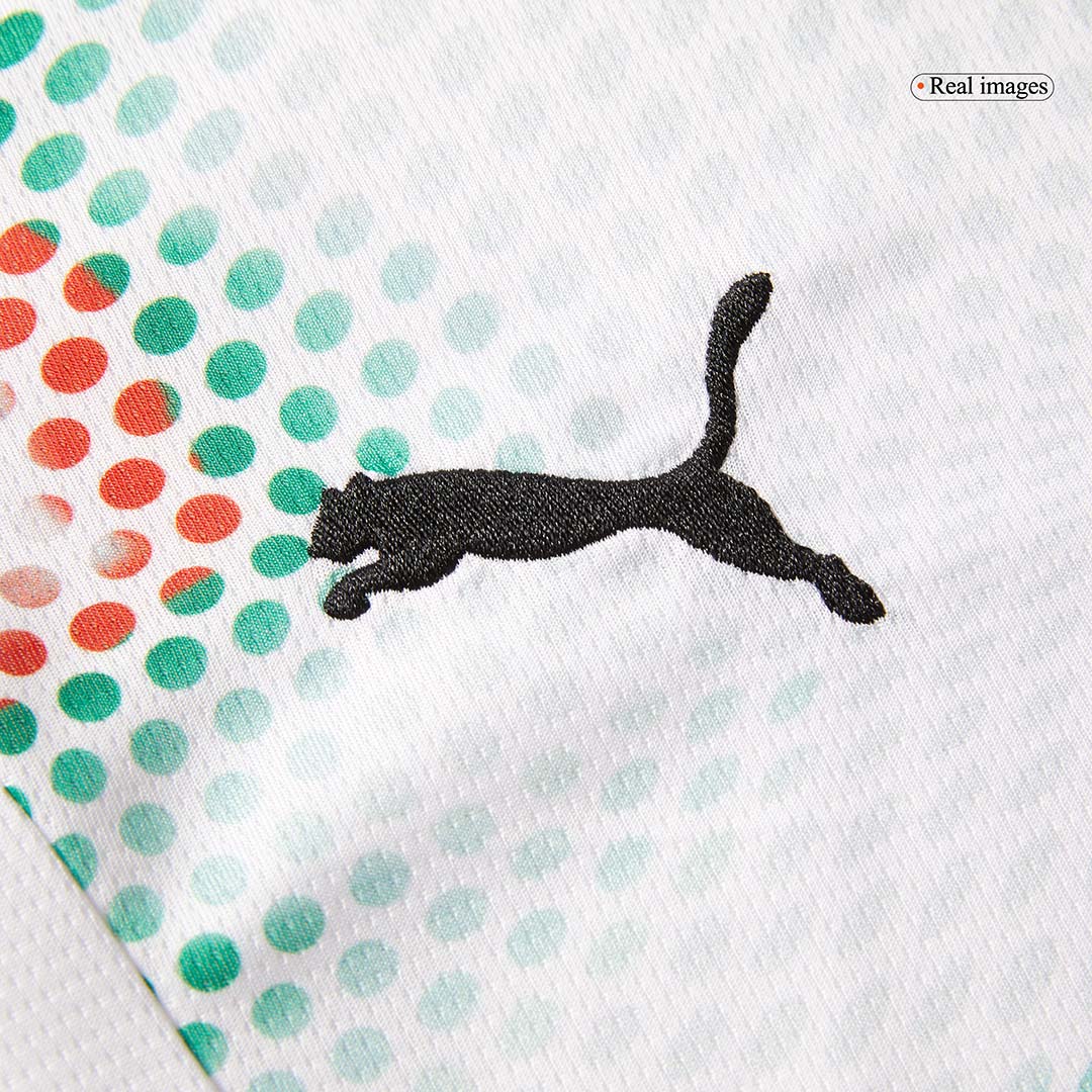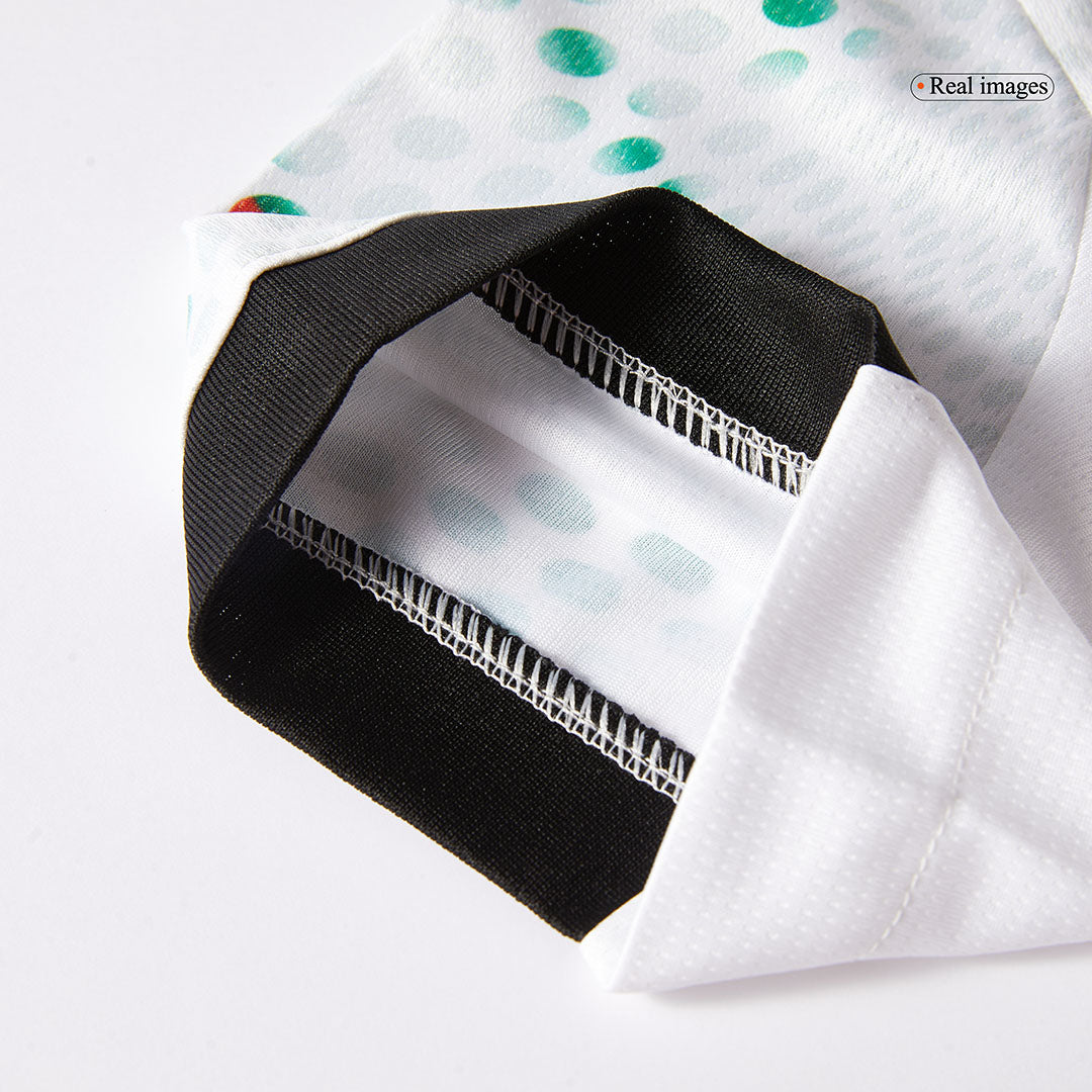 Het shirt is overwegend wit, afgewerkt met stippen in wit, groen en rood – een moderne mix van traditie en hedendaags design. Dit unieke ontwerp staat symbool voor de puurheid en passie waarmee Portugal voetbal beleeft.