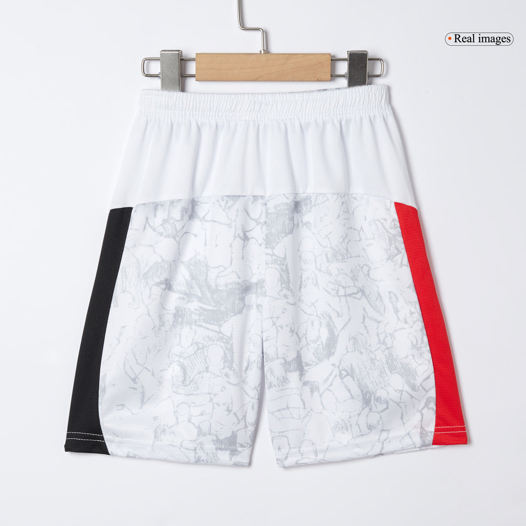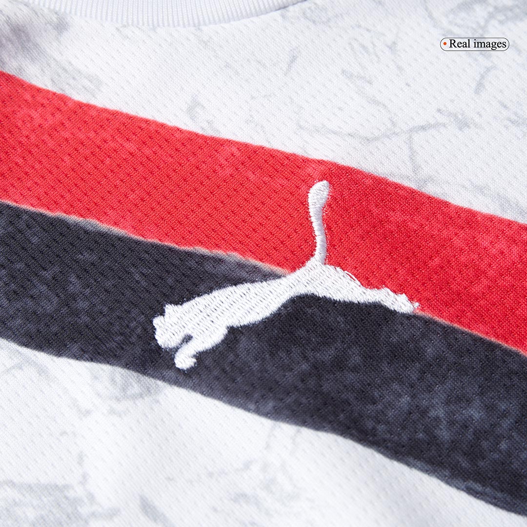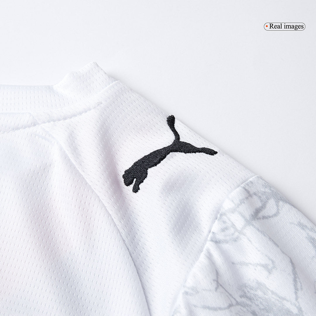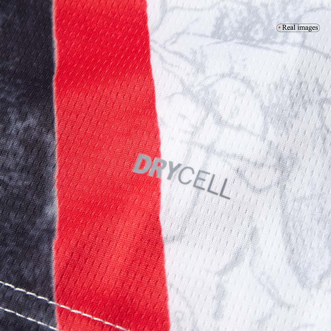 Overwegend uitgevoerd in wit, wordt het tenue gekenmerkt door een krachtige zwart-rode sjerp die verwijst naar het klassieke derde shirt van 2009–2011. Wat dit Manchester City voetbalshirt nog specialer maakt, is het Poznań-patroon: fans die arm in arm met hun rug naar het veld feestvieren – een unieke ode aan de supporterscultuur van City.