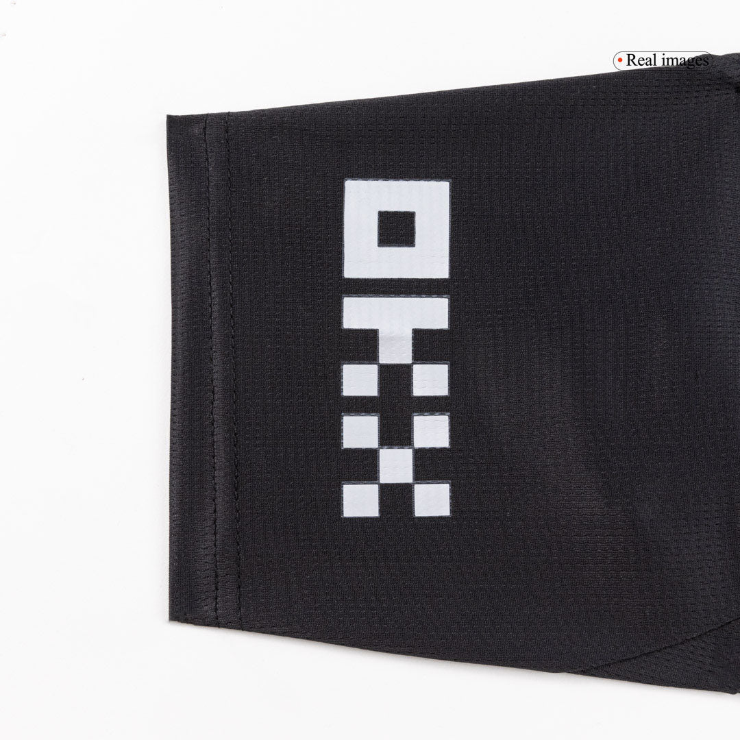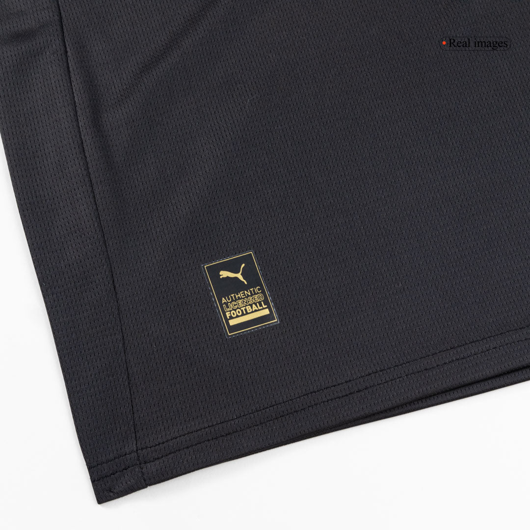 Het Manchester City Uitshirt 2025/26 neemt fans mee terug naar de oorsprong van de club, met een gedurfd zwart design geïnspireerd op het allereerste tenue uit 1884. Het strakke ontwerp wordt gekenmerkt door zwart als basiskleur, metallic zilveren logo’s voor een premium uitstraling en een klassieke polokraag met zilveren afwerking.