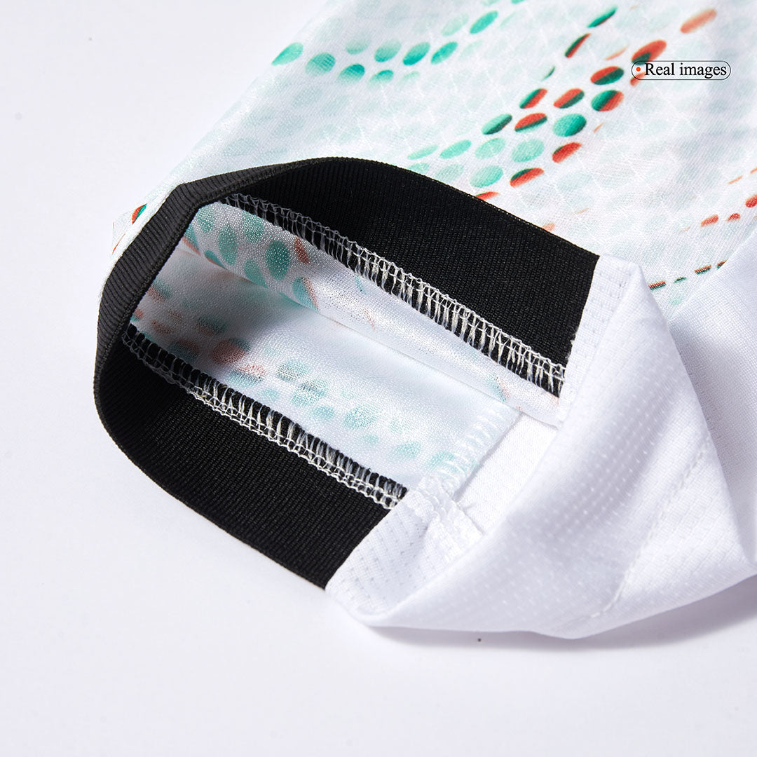 Het shirt is overwegend wit, afgewerkt met stippen in wit, groen en rood – een moderne mix van traditie en hedendaags design. Dit unieke ontwerp staat symbool voor de puurheid en passie waarmee Portugal voetbal beleeft.